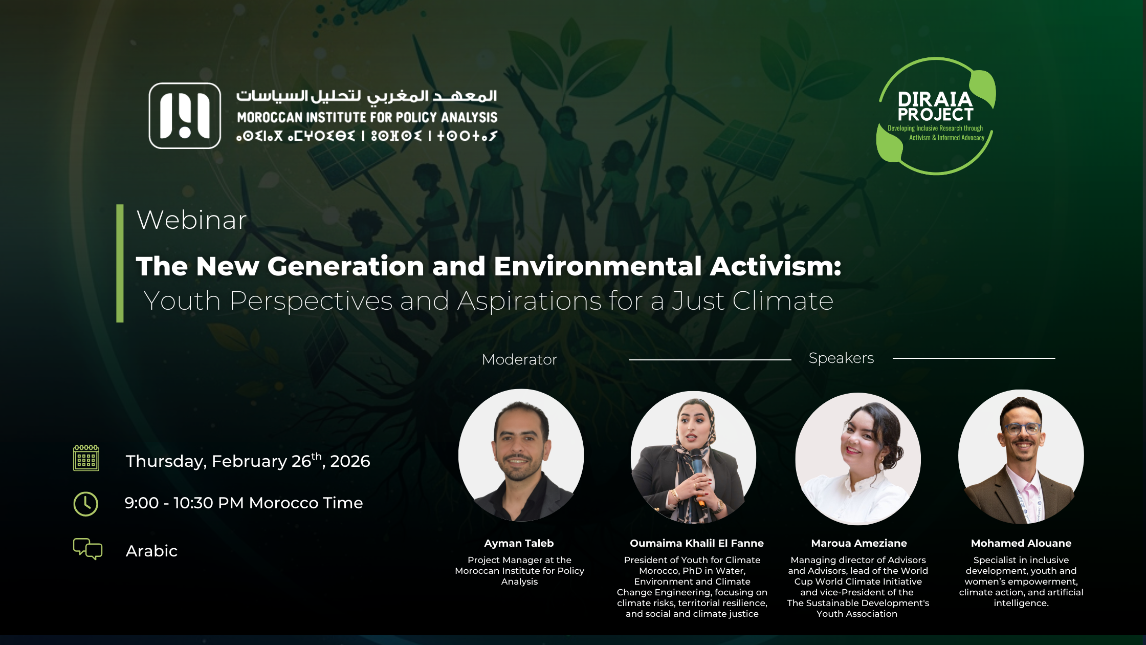 The Moroccan Institute for Policy Analysis (MIPA) is pleased to invite you to an online webinar held within the framework of the DIRAIA project, addressing the role of the new generation in environmental activism amid escalating climate challenges.In the context of worsening climate impacts, young people in Morocco and the region are emerging as a dynamic force reimagining environmental action and advocating for a more just and sustainable future. Despite high levels of awareness regarding climate change, organized participation in environmental initiatives remains limited, even as willingness to engage more actively continues to grow.
